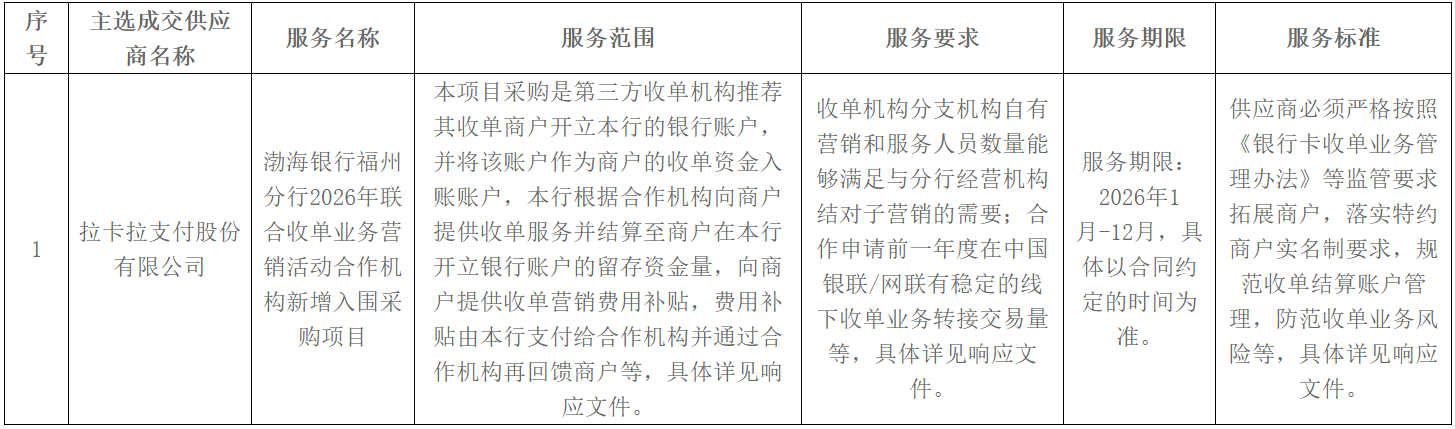二、项目名称:渤海银行福州分行2026年联合收单业务营销活动合作机构新增入围采购项目