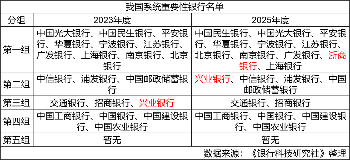 值得一提的是,我国系统重要性银行前后发布了4个年度的名单,包括2021年度、2022年度、2023年度、2025年度。第五组未曾有银行进入,第四组一直是“四大行”。兴业银行则是在前三个年度中位列第三组,这是首次调整至第二组。