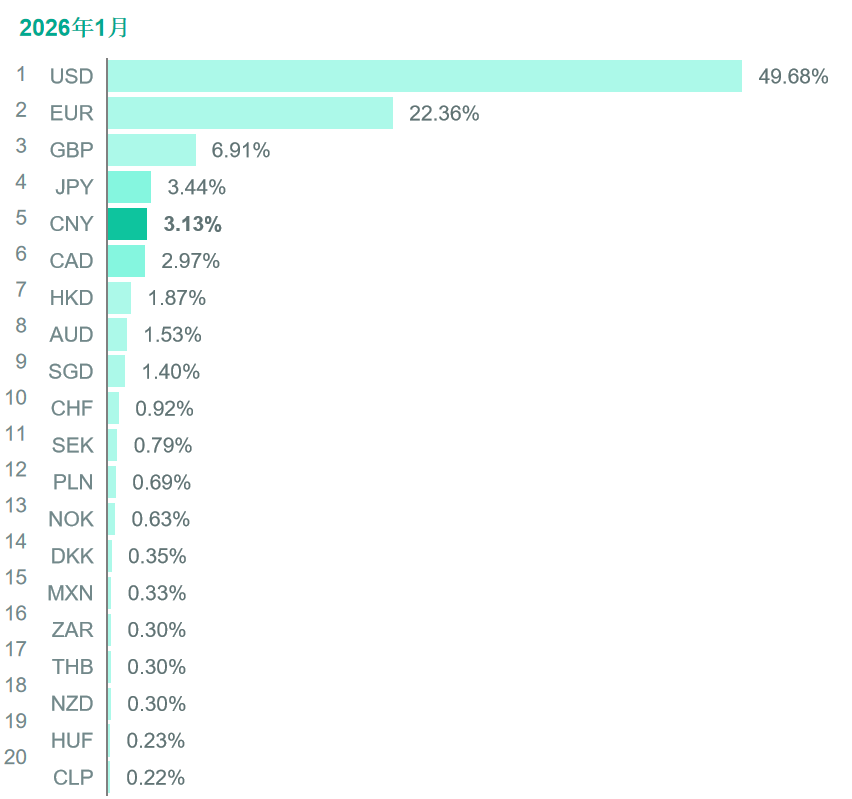 SWIFT公布的数据显示,2026年1月人民币在全球支付中占比3.13%,前值为2.73%,排名第5位。