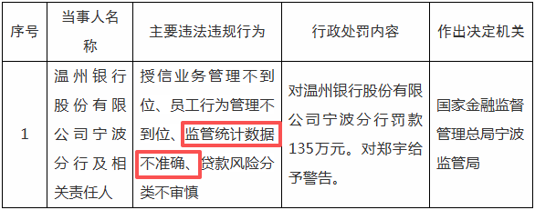 1月30日,金融监管总局宁波监管局发布的行政处罚信息显示,温州银行宁波分行因“监管统计数据不准确”等4项违法违规行为,被罚款135万元。同时,相关责任人郑宇被警告。