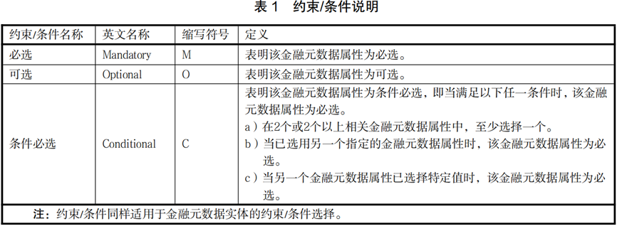 约束/条件方面。金融元数据的约束/条件是用于描述金融元数据属性的一个说明符,说明一个金融元数据属性在金融元数据中是始终选用还是有时选用(即有值)。当该金融元数据为条件必选时,宜注明其必选条件。