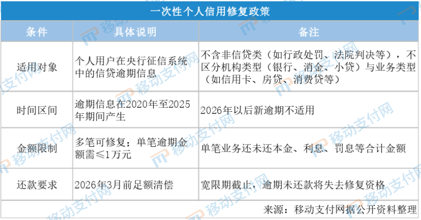 近期,央行总行及地方分行均召开了2026年工作会议,“实施好一次性个人信用修复政策,健全社会征信体系”等相关内容均有被提及。央行在去年年底推出的一次性信用修复政策,可以说回应了在特殊时期部分金融消费者因非主观因素造成逾期的诉求。