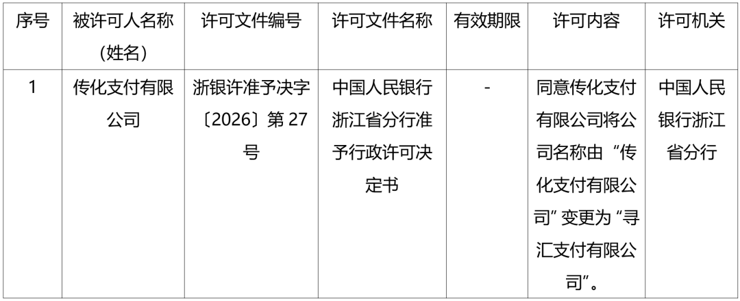 近日,中国人民银行浙江省分行更新《非银行支付机构重大事项变更许可信息公示》,同意传化支付有限公司将公司名称由“传化支付有限公司”变更为“寻汇支付有限公司”。