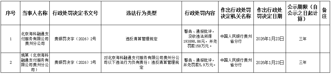 具体来看,海科融通贵州分公司因违反清算管理规定,被警告、通报批评,没收违法所得193898.86元,并处罚款158万元。