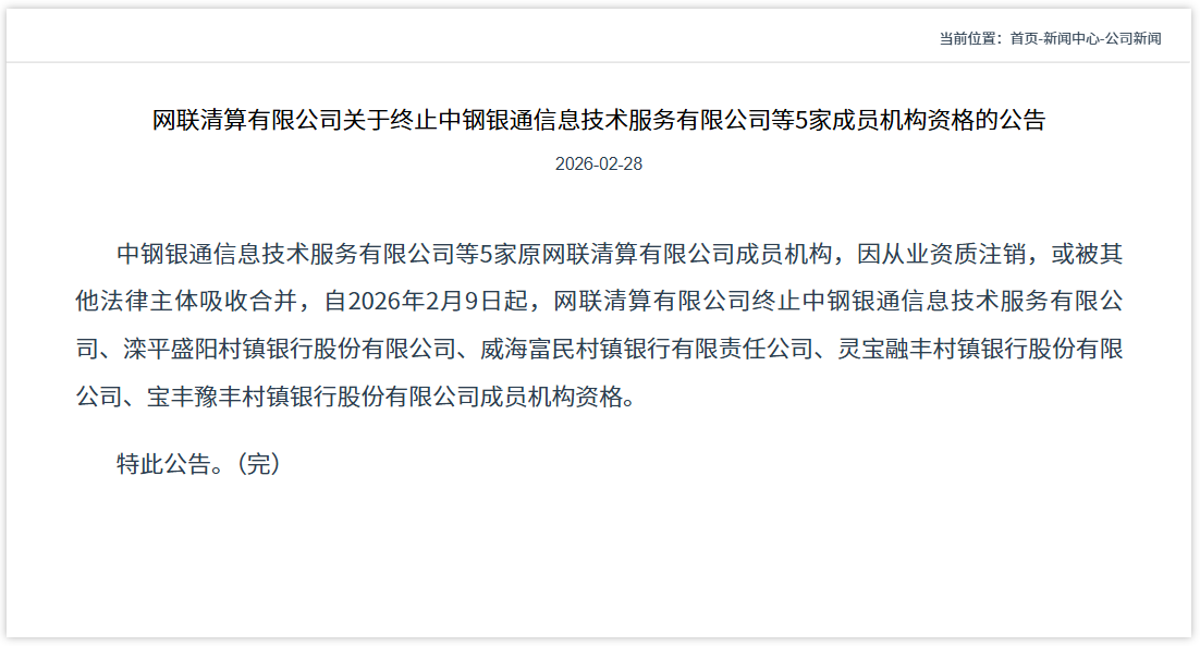 第一则公告显示,中钢银通信息技术服务有限公司(下称“中钢银通”)等5家原成员机构,因从业资质注销,或被其他法律主体吸收合并,自2026年2月9日起被终止成员机构资格,涉及中钢银通信息技术服务有限公司、滦平盛阳村镇银行股份有限公司、威海富民村镇银行有限责任公司、灵宝融丰村镇银行股份有限公司、宝丰豫丰村镇银行股份有限公司。