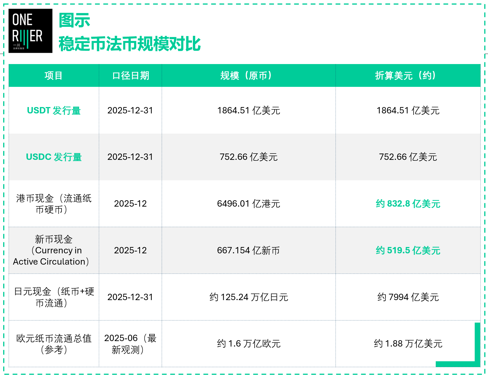 虽然这个比较在数据口径上多多少少不那么严谨,但是作为一个感性理解,仅USDT+USDC两个币种,它现在已经是港币现金流通量的约3倍、新加坡币现金流通量的约5倍,大约相当于日本现金流通量的三分之一,显著大于很多“中等体量货币”在M0口径下的现金规模。