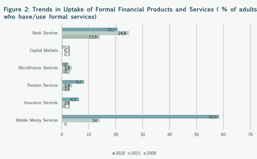 数据显示,移动支付、养老金服务和保险服务是发展最快的产品类别。2009年至2020年间,移动支付普及率从几乎零飙升至58.4%,成为赞比亚最普遍的金融产品,超过了银行服务的20.7%。同期,养老金服务覆盖率上涨5.4个百分点,达到8.2%,保险服务上涨5.1个百分点,达到6.3%。这些趋势展示了金融科技创新和移动技术如何重塑赞比亚的金融格局,促进更大的经济包容性。