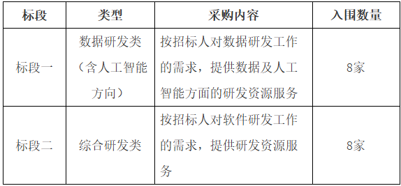 本次通用研发资源服务包括两个标段,分别为“数据研发类(含人工智能方向)”与“综合研发类”,投标人可兼投兼中,内容如下: