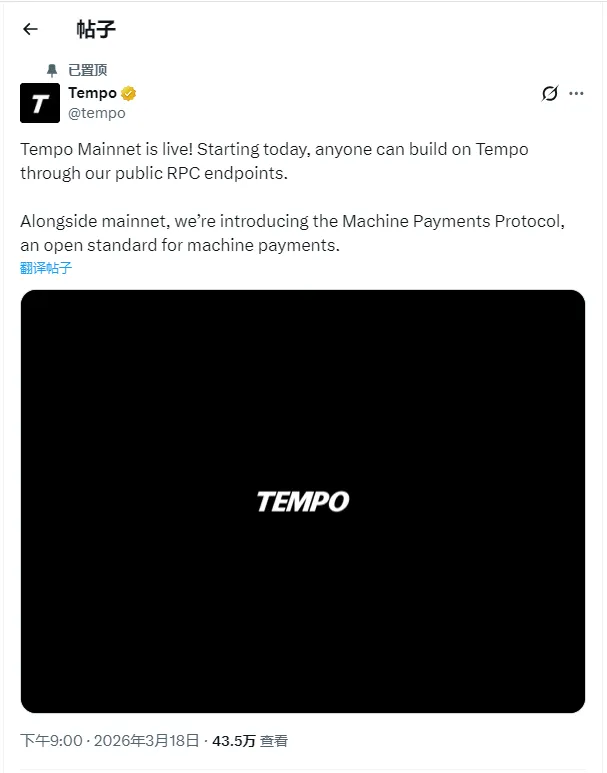 移动支付网3月18日消息,稳定币支付公链Tempo宣布主网正式上线。这意味着,所有开发者都可以通过公共RPC(远程过程调用)端点在Tempo上进行开发。除了主网之外,Tempo还将推出机器支付协议(MPP协议),该协议也是一项开放标准。