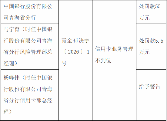 3月20日,国家金融监督管理总局青海监管局发布的最新罚单显示,中国银行青海省分行因信用卡业务管理不到位被处罚款55万元 。同时,时任该行风险管理部总经理马宁育被罚款5.5万元 、信用卡部总经理杨峰伟被给予警告 。
