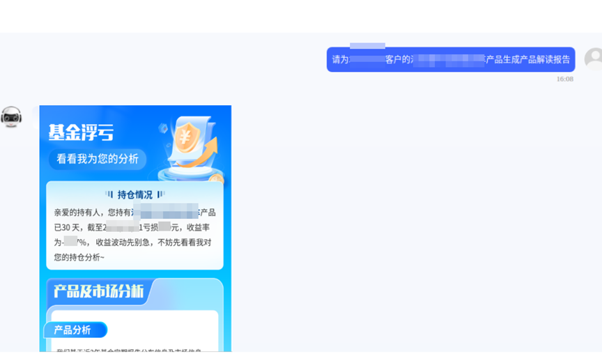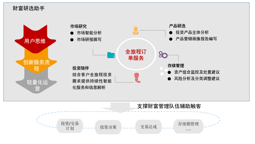 财富研选助手秉承“以客户为中心”的核心理念,聚焦投资市场分析、产品研究、投资陪伴及跟踪管理等关键环节,打造覆盖财富管理全流程的智能化服务解决方案,能够对传统销售导向型服务模式中高度依赖人工处理的低效流程进行有效重构,提升业务质效,全面优化客户体验与满意度。