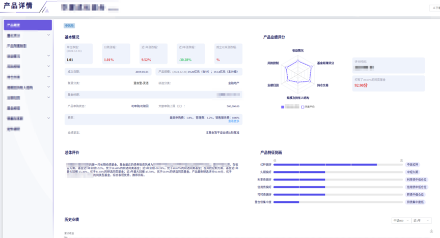 为快速定位刻画产品,提升财富管理队伍选品配置效率,财富研选助手针对全市场产品构建产品标签库,包含超千项产品标签及多种可视化组件,并通过大模型技术精准识别用户需求,动态生成自定义产品画像,可将单产品画像生成时间从平均0.5个工作日大幅压缩至秒级。此外,财富研选助手创新融合多因子量化评分模型及专家研选经验,构建商业银行专属产品的研选评分体系,能够实现同类产品多维度量化评分及品类优选,为财富顾问提供产品营销话术生成、业绩分析、特征解读等全方位分析支持。这些功能极大便利了财富管理队伍高效筛选目标产品、实现客户与产品精准匹配,有效提升产品遴选效率和投资决策胜率。