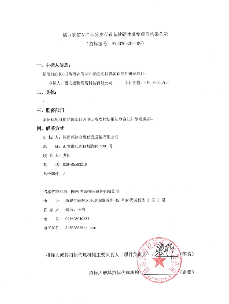 陕西农信NFC标签支付设备软硬件研发项目结果公示