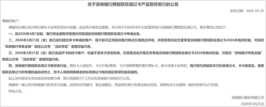 3月25日,浙商银行发布公告称,因业务升级优化需要,该行将于2026年4月1日起暂停发行浙商银行携程联名借记卡,相关事项公告如下: