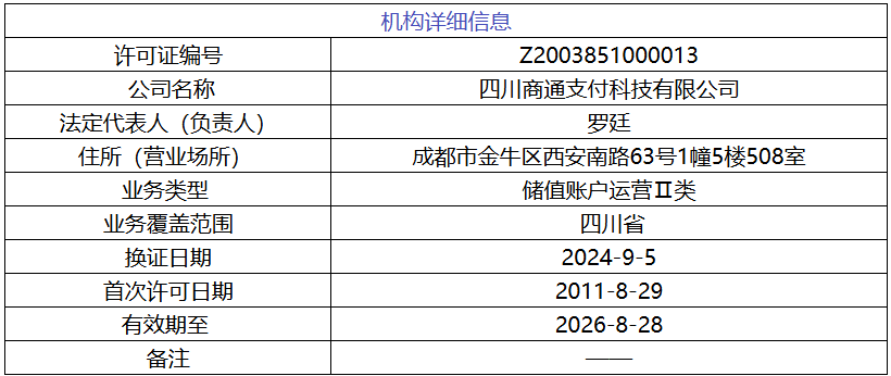 据移动支付网了解,商通支付成立于2006年8月,是四川省商业投资集团有限责任公司控股的省属国有控股子公司,是四川首批获得中国人民银行《支付业务许可证》的非银行支付机构,分别于2016年8月、2021年8月成功续展。支付业务类型的重新划分后,商通支付业务类型变更为“储值账户运营Ⅱ类”。