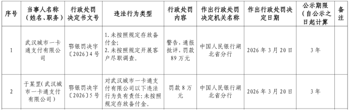 移动支付网消息:3月27日,人民银行湖北省分行最新公布的行政处罚(鄂银罚决字〔2026〕4号、5号)显示,武汉城市一卡通支付有限公司(简称“武汉一卡通”)因存在未按规定存放备付金、未按规定开展客户尽职调查两项违法违规行为,被处以警告、通报批评及89万元罚款,相关责任人某罡被罚款8万元。