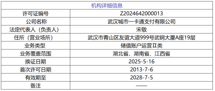 公开资料显示,武汉一卡通是推进武汉数字化城市建设,实现政府公共管理和对公众服务的高效便捷的全市一卡通工程项目,其发行的“武汉通”卡在武汉全市各领域使用,并逐步向武汉“1+8”城市圈拓展。武汉一卡通于2013年获得人民银行颁发的《支付业务许可证》,获准在湖北、湖南、江西等地开展预付卡发行与受理业务(储值账户运营Ⅱ类)。