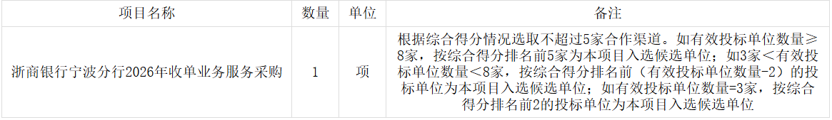 参照《中华人民共和国招标投标法》等法律法规规定,浙商银行股份有限公司宁波分行就浙商银行宁波分行2026年收单业务服务采购进行公开招标采购,欢迎国内合格的投标人积极参加。