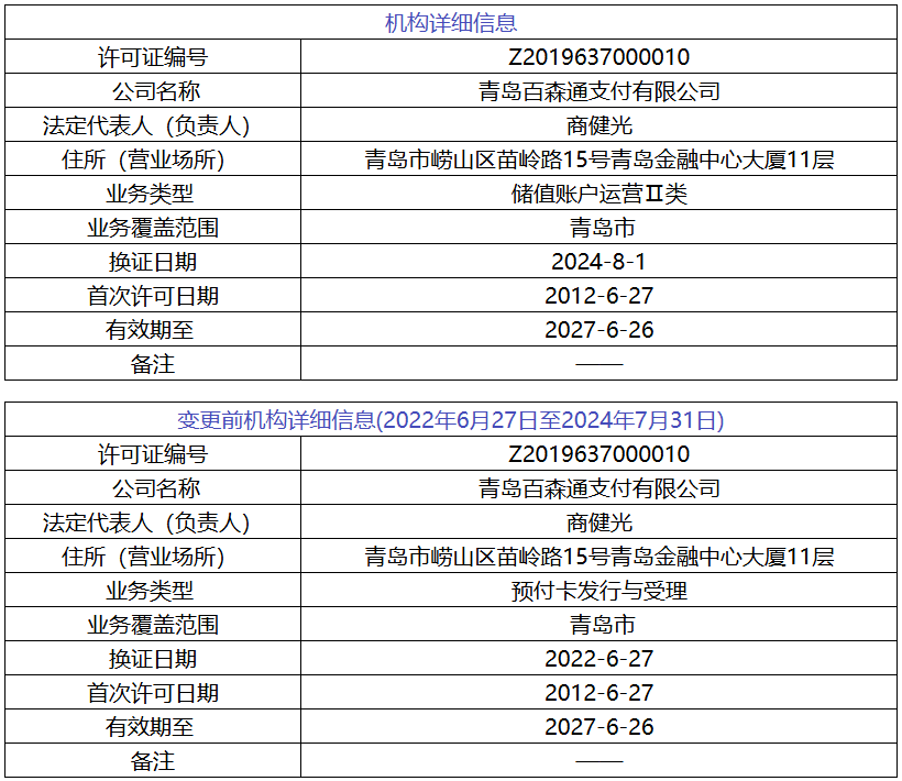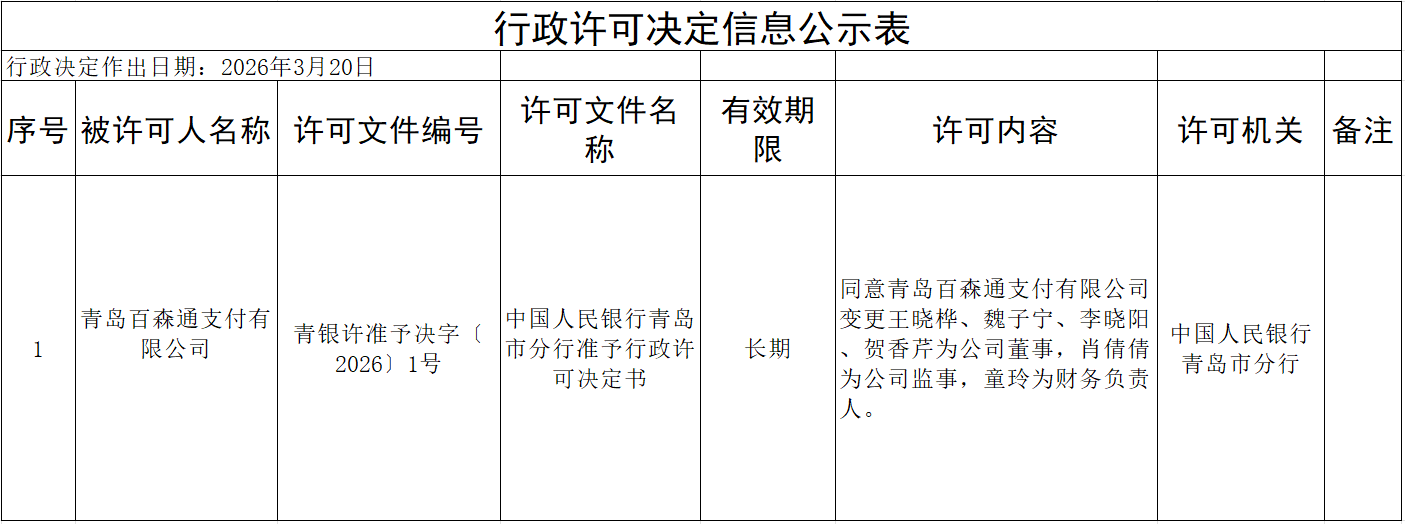 中国人民银行青岛市分行非银行支付机构变更事项许可信息公示表(2026年3月20日)显示,同意青岛百森通支付有限公司(下称“青岛百森通支付”)变更王晓桦、魏子宁、李晓阳、贺香芹为公司董事,肖倩倩为公司监事,童玲为财务负责人。