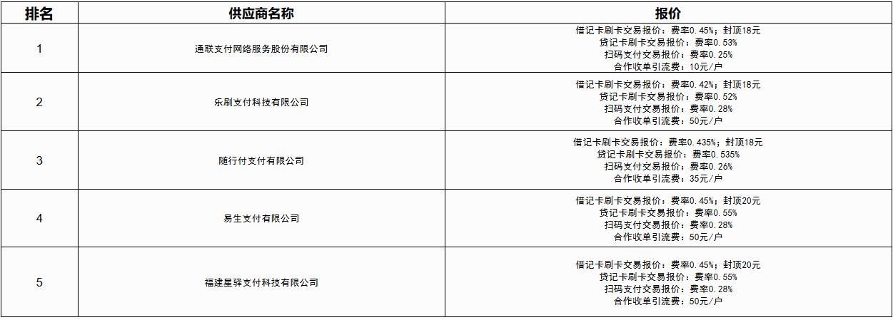 招标内容:确定5家中标供应商进行合作收单项目合作