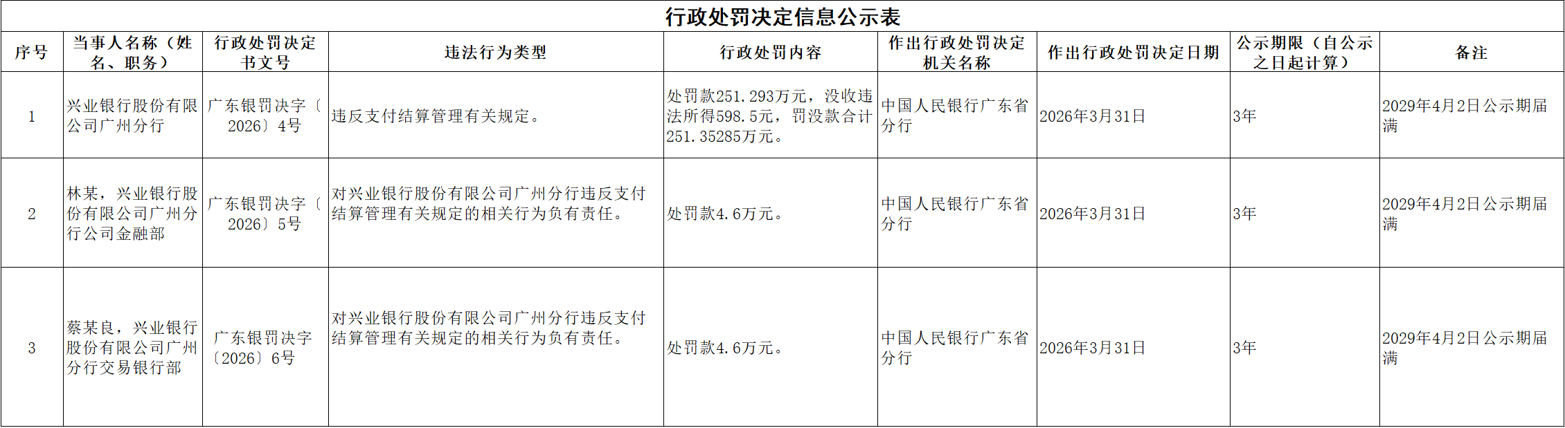 兴业银行广州分行因违反支付结算管理规定被罚没超250万