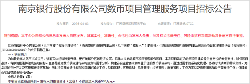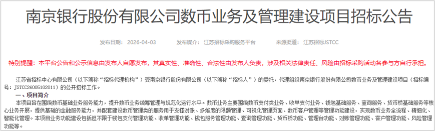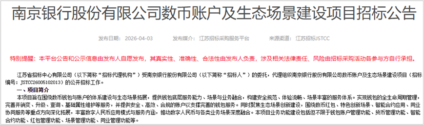4月3日,南京银行股份有限公司(以下简称“南京银行”)在江苏招标采购服务平台发布了三则招标公告,分别是“数币项目管理服务项目”“数币账户及生态场景建设项目”以及“数币业务及管理建设项目”。