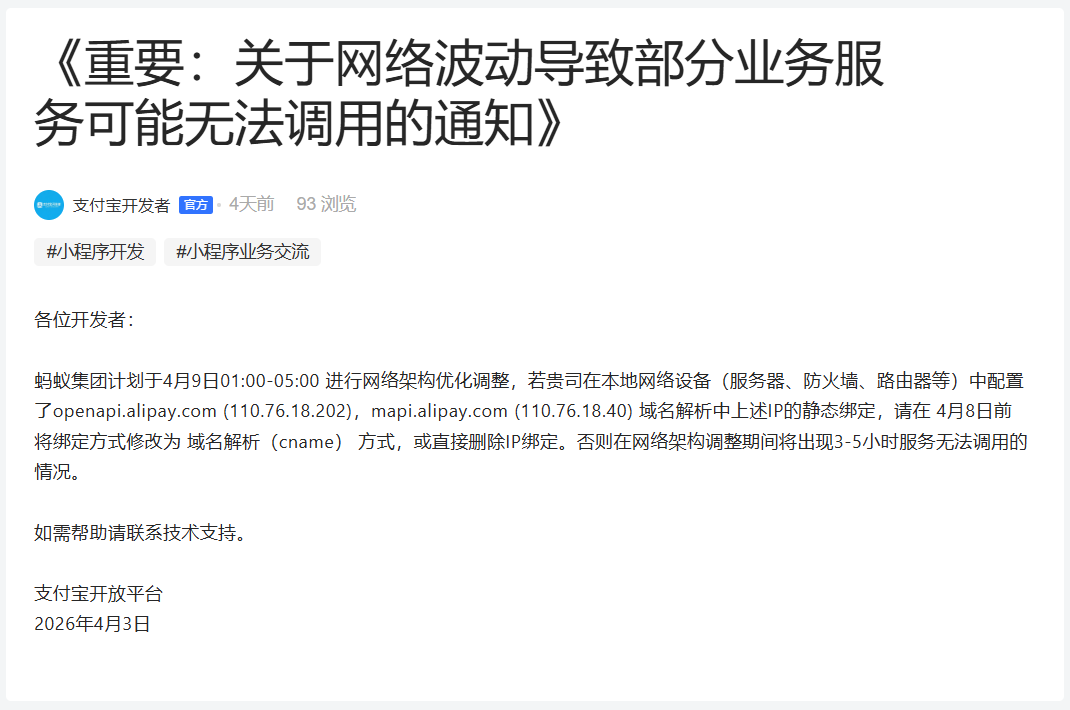 4月3日消息,支付宝开放平台发布公告称,蚂蚁集团计划于4月9日1时至5时进行网络架构优化调整。若开发者在本地服务器、防火墙、路由器等设备中,对openapi.alipay.com、mapi.alipay.com解析出的相关IP做了静态绑定,需在4月8日前改为域名解析(CNAME)方式或删除IP绑定,否则调整期间可能出现3至5小时服务无法调用。对商户小程序及开放接口接入方而言,这次通知落点在接口可用性与网络配置合规。