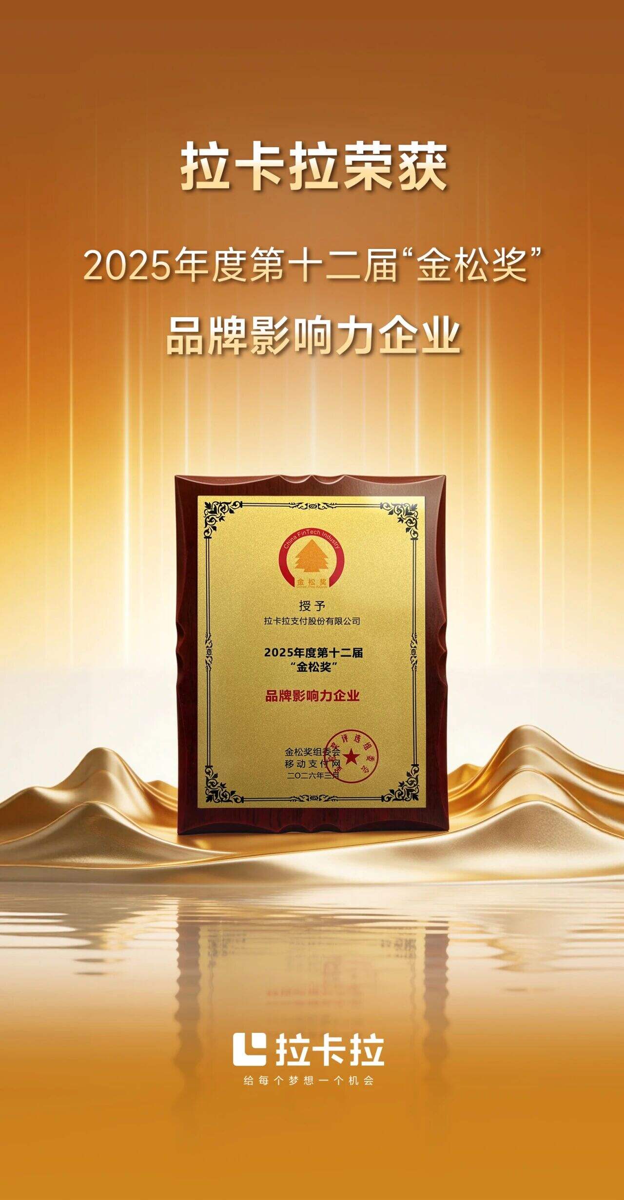 近日,2025年度第十二届“金松奖”金融科技行业评选结果正式揭晓,拉卡拉凭借行业领先的数智服务能力,荣获2025年度“品牌影响力企业”称号。