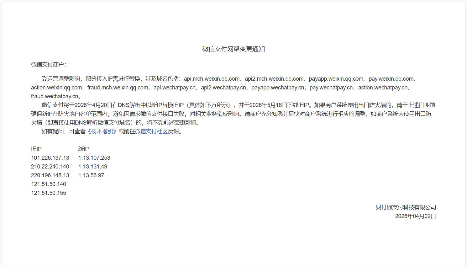 微信支付网络变更,将于5月18日下线旧IP