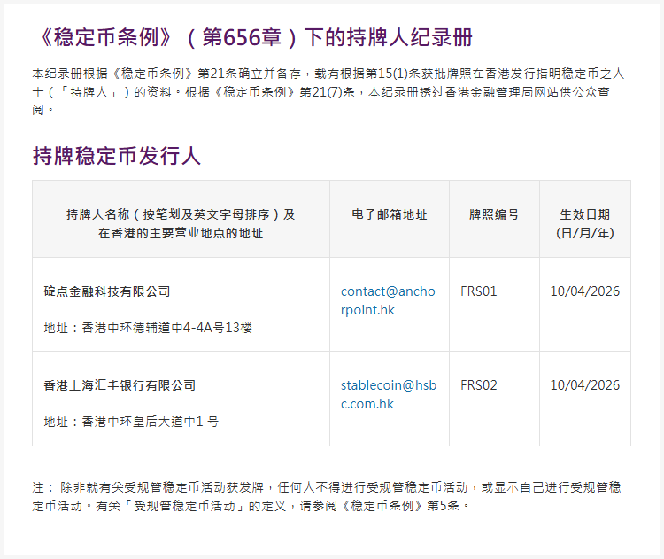 据移动支付网了解,碇点金融科技有限公司(Anchorpoint)是一家专为香港合规稳定币业务设立的合资金融科技公司,由银行(渣打银行)、电信(香港电讯)、Web3巨头(安拟集团)三方合资,资源互补性极强;香港上海汇丰银行有限公司则是汇丰集团的创始成员,也香港最大的注册银行,作为港币三大发钞行之一,在全球金融与香港经济中都具有重要地位。