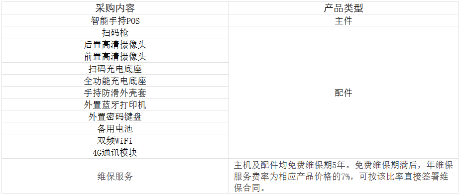 采购内容:包括智能手持POS及扫码枪、后置高清摄像头、扫码盒子等配件设备,具体详见下表。