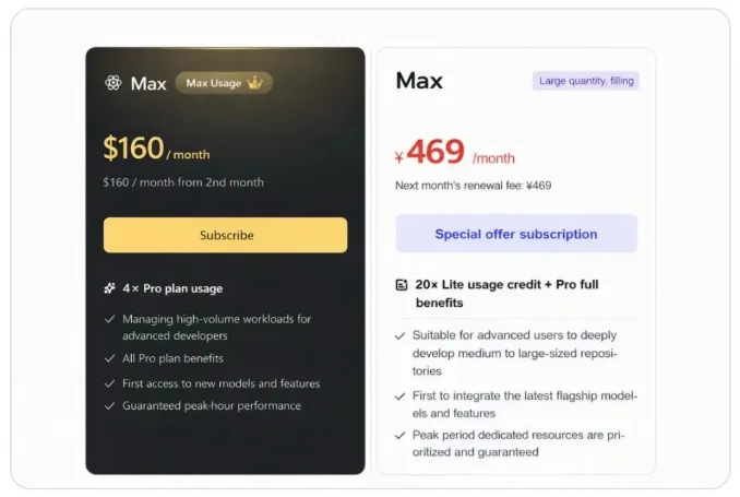比如,一个智谱GLM Coding Plan用户在社交平台上吐槽表示,同样的Max套餐,中国用户的费用是人民币469元每月(约合68美元每月),而海外用户则要160美元每月(约合人民币1100元每月),其中差价超过一倍。