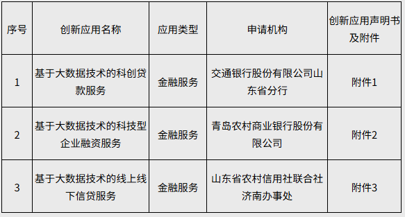 该批次金融科技创新应用申请机构均为银行,包括交行山东省分行、青岛农商银行、山东省联社济南办事处,涉及大数据、API、OCR、区块链、隐私计算、数据沙箱、数据建模等技术,聚焦科技型小微企业融资、线上线下信贷等领域。