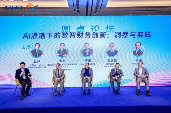 “AI 浪潮下的数智财务创新”圆桌,由汇付天下 CFO 金源主持,与德勤亚太审计与鉴证数字化赋能及 AI 主管合伙人、澳洲会计师公会华东和华中区委员会会长金科,Tims咖啡CFO李东,吉祥航空CFO张言国,云简业财CEO俞洋展开交流。