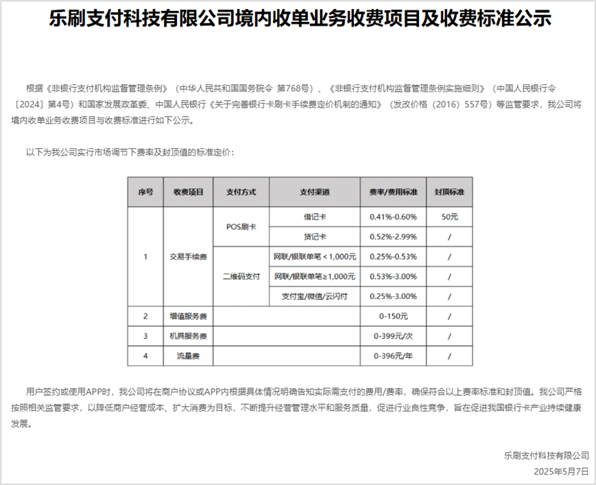 近日,乐刷支付再次公示境内收单业务收费标准。对比2025年5月7日版本和2026年4月13日版本,POS刷卡、二维码支付等主交易费率区间未见变化,机具服务费和流量费也保持不变,主要调整落在增值服务费,上限由150元升至399元。