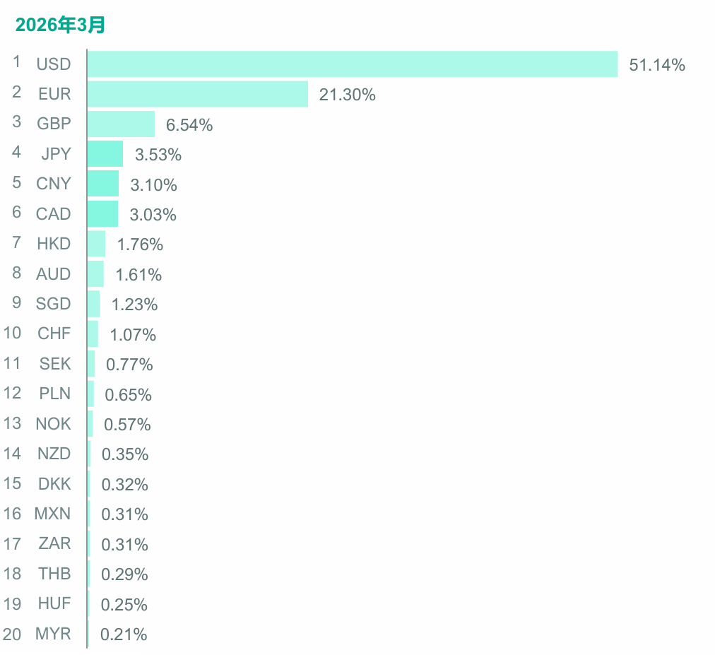 3月美元在国际交易的占比升至51.14%,相比2月为49.2%,创下自2023年以来新高。全球支付排名的第二的是欧元,占21.3%,其次是英镑、日元,占比分别是6.54%、3.53%。