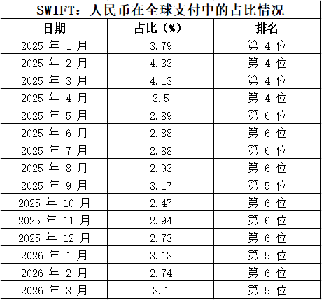 SWIFT:2026年3月人民币在全球支付中占比3.1%