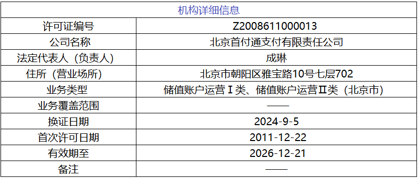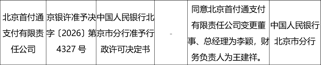 中国人民银行北京市分行非银行支付机构重大事项变更许可信息公示显示,同意北京首付通支付有限责任公司(下称“首付通支付”)变更董事、总经理为李颖,财务负责人为王建祥。